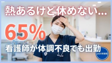 看護技術・看護関連 「熱あるけど休めない…」看護師の65%が体調不良でも出勤している現実【2025年研究】 「ちょっと熱っぽいけど、今日休んだら誰がカバーするの...?」「昨日から頭痛いけど、有休もう残ってないし...」「体調悪いって言ったら、また嫌な顔されるんだろうな...」こんな経験、看護師界隈ではマジで日常茶飯事じゃないですか?体調悪いのに... 2026.02.05 看護技術・看護関連